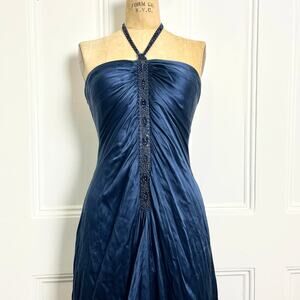Adrianna Papell Boutique Vintage Navy Halter Elegant Silk Long Maxi Dress, with beautiful decorated beaded sparkle halter strap and strip going in the middle with an open back and zip up. It is flowy on the bottom and cinches the waist so well. Such a majestic glamours vintage piece.