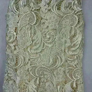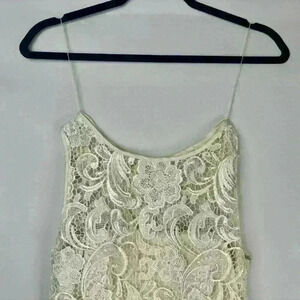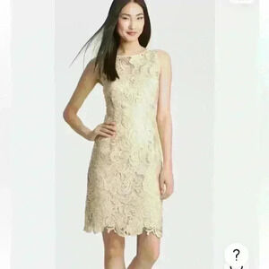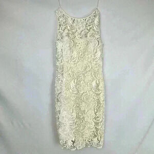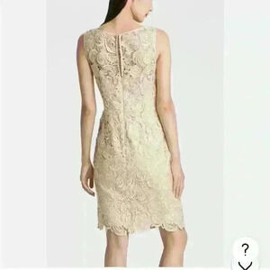 In great preloved condition! Beautiful lace detail. Gorgeous Adrianna Papell champagne/gold lace cocktail dress. Perfect for a wedding or cocktail party.