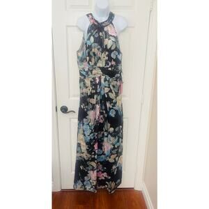 Stunning Adrianna Papell chiffon gown with a captivating floral print. This halter neck maxi dress is perfect for special occasions and formal events. The sleeveless design and hidden back zipper create a seamless, elegant look. Size 14.