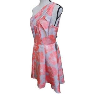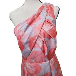 The Adrianna Papell Coral Floral Jacquard Midi One Shoulder dress in size 6 is a stunning piece perfect for a wedding, party, or formal occasion. The dress features a sleeveless design with a one shoulder neckline and a zip closure. Made from polyester jacquard fabric, it boasts a coral floral pattern and a fit & flare style. With a midi length and lined interior, this dress is a stylish and elegant choice for any season.