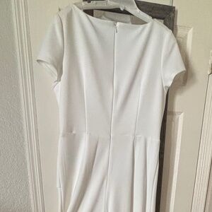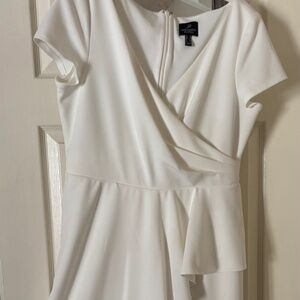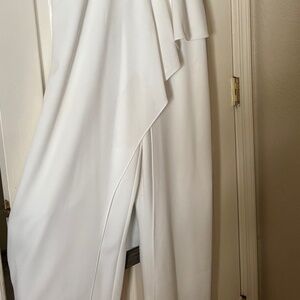 Elegant ivory pantsuit with ruffle overlay that gives the feel of a gown. Lined completely with luxurious silky fabric. Crepe feel exterior. Unfinished hem. Perfect for beach or outdoor event in warm weather. Shown with cardigan not included.
