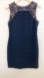 This elegant sleeveless navy blue shift dress features a sophisticated lace neckline & a chic layered design. Each layer is 3/4”. Perfect for any formal occasion. Content is 95% Polyester & 5% Elastane. Fabric has good stretch. Lace areas is lined with cream color fabric. Back zipper & single eyelet closures. Measurements flat are approximately 17.75” pit to pit & 34.25” long. In excellent preowned condition with NO spots or damage.
