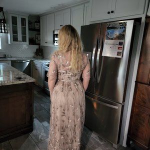 Oh my! I bought this as the Mother of the Groom. Wedding in September. So VERY excited for my son and future bride. This is a beautiful gown and would have been PERFECT if it would've fit! I bought it online from Adrianna Papell website in a size 10. (at that time size 12 & 14 were sold out) Long story but I recently lost weight and thought I'll fit in a 10. Wrong. And now they are all sold out of pretty much all sizes except the smaller ones. So I have to switch gears to something else. Adrianna Papell size chart stated for a size 10 - measurements are as follows: Bust 37.5, Waist 30.5, Hips 40.5. It would've probably saved me some hassle if I would have reviewed that first instead of just impulse buying because I was in love with the dress and wishful thinking I could squeeze into a 10 or maybe just maybe I'll lose alittle more before September. Right!!!! My measurements are Bust 41, Waist 36, Hips 40 and this baby would NOT zip up on me at ALL. Color is Champaigne Gold. Pictures do NOT do it justice. It sparkles like crazy. It's elegant and beautiful. It's BRAND NEW with tags. It's only been taken out of the bag and tried on and then right back in the bag.