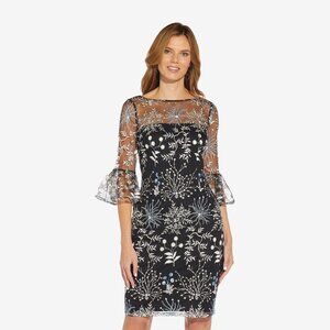 Adrianna Papell Embroidered Three Quarter Sleeve Short Sheath Dress With Bell Sl