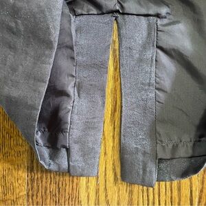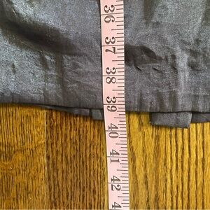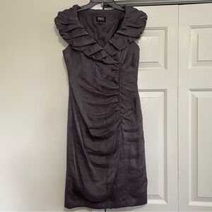 This dress is an Adrianna Papell Evening cocktail/semi-formal dress in a silver/dark granite metallic color. The collar ruffles all the way around and V's in the front. There is ruching on one side and the dress zips on the side. The dress is fully lined and has a small split in the back at the bottom hem. Dress is in excellent condition and is a size 8.