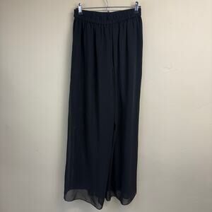 BLack palazzo pants with sheer overlay, side zip and snap button and clasp closure, and elastic waist. Size 8 and in very good vintage condition.