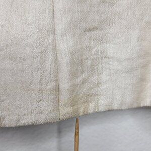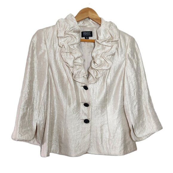 Beautiful champagne color has a light shimmer, and the ruffled neckline adds a touch of elegance. The 3 buttons down the front are made up of individual black rhinestones. This gorgeous jacket pairs well with any style dress pant for a holiday party, night out to the theater, or any other more formal event. There is a yellowish stain on the center back hem (pictures 12-13) and on the...(picture 14). But given the color, it doesn't stand out too much when wearing. Otherwise, in EUC with no holes or snags.
