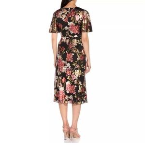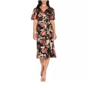 Adrianna Papell Floral Foiled Print Mesh Draped Midi Dress Size 6