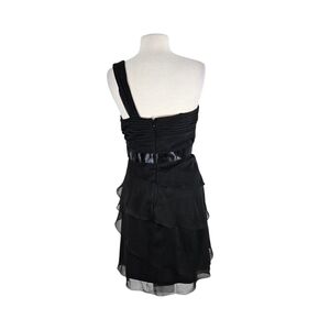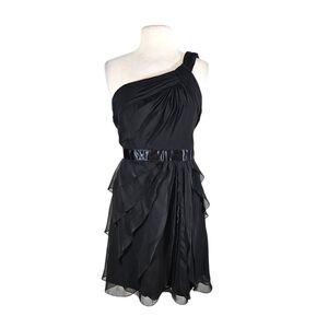 Turn heads in this tiered chiffon mini dress by Adrianna Papell. This dress is crafted from ethereal chiffon fluttery fabric tiered to perfection for a layered look, finished with a satin waistband. Features and elegant one shoulder silhouette perfect for your next evening event. Hidden back zipper. In excellent condition.