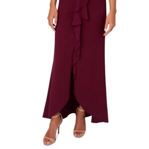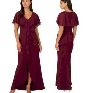 Adrianna Papell Crepe Chiffon Gown in Burgundy. Women's size 2. Fully lined, made of polyester and spandex. Has a back zipper. Flutter sleeves are sheer cape style. Has a cascading ruffle. Inner snaps to secure your bra straps. Very pretty!