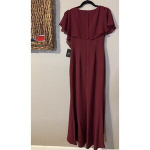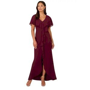 Adrianna Papell Crepe Chiffon Gown in Burgundy. Women's size 6. Fully lined, made of polyester and spandex. Has a back zipper. Flutter sleeves are sheer cape style. Has a cascading ruffle. Inner snaps to secure your bra straps. Very pretty!