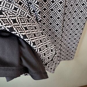 This dress is fully lined. Exterior is a black and white geometric print on a textured dress. Darts added to be complementary on all body shapes.