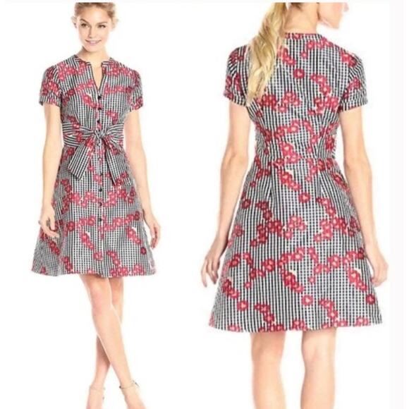 Adrianna Papell Gingham Floral Tie Button Up Short Sleeve Above Knee Dress Sz 8