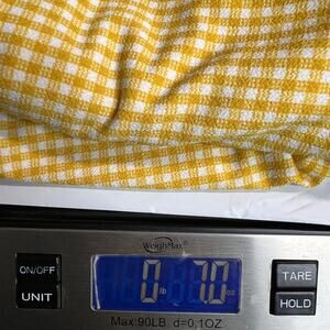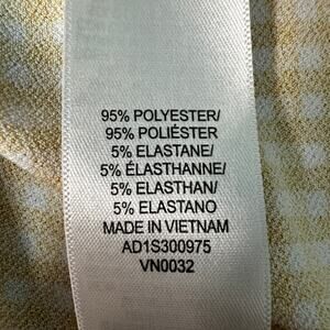 Adrianna Papell women's gingham print top in yellow & white. High neck with ruffle trim. Sleeveless. Flowy fit. Stretch. In good used condition. No stains, tears or holes.