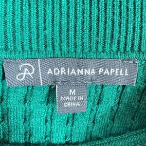 Excellent preowned condition. Adrianna Papell Green Cable Knit Lightweight Crew Neck Sweater Button Detail. Has 3 gold buttons on either side of neck. Cuffs taper in from sleeve. Viscose/polyester/nylon material. Approx. measurements: Shoulder to hem 23", pit to pit 18", sleeve from neck to sleeve hem 27". Size M.