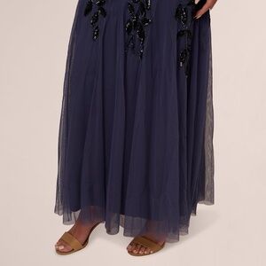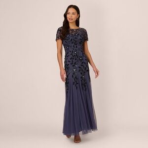 Adrianna Papell Hand Beaded Short Sleeve Floral Godet Gown In Smoky Peri Size 12