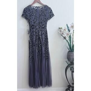 Adrianna Papell Hand Beaded Short Sleeve Floral Godet Gown in Moonscape Dress 0