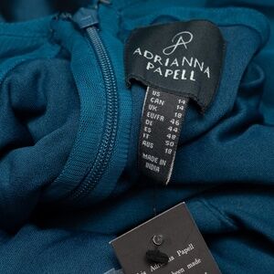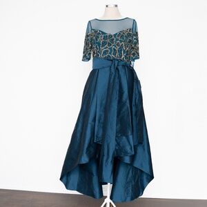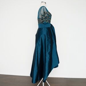 A true statement piece, this Adrianna Papell gown combines rich detail with dramatic structure. The bodice shimmers with hand-sewn beading and sequins arranged in bold floral patterns over a sheer illusion neckline and elbow-length sleeves. A wide bow cinches the waist before flowing into a crisp taffeta skirt, designed with cascading layers and a dimensional high-low hemline that moves beautifully. Fully lined with a hidden back zipper, this gown balances timeless elegance with a modern silhouette—perfect for weddings, galas, or any evening celebration where luxe detail is a must.
