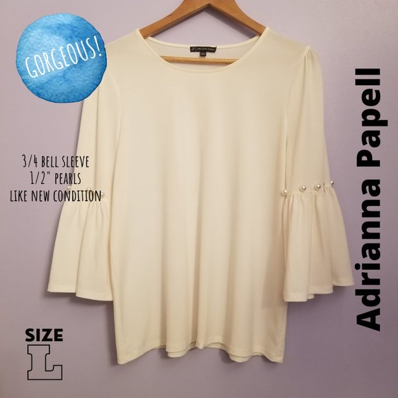 Adrianna Papell 3/4 sleeve ivory tunic/blouse. Gorgeous bell sleeves with 1/2" pearls around the elbows. Comfortable and elegant stretchy polyester/elastane.