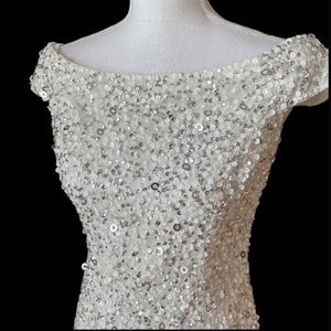 Chic ivory mini dress with shimmering sequins. Off-shoulder style. Ideal for elegant events.