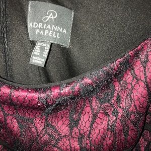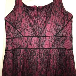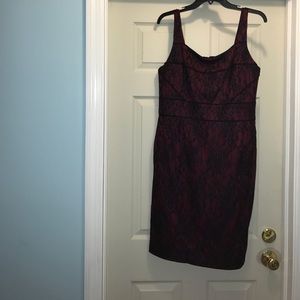 Deep red dress with black lace overlay details. Cocktail length with two shoulder straps and zipper up back. Worn two times, great condition.