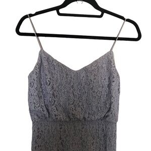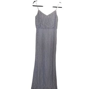 Pastel lace drapes with the blousy silhouette of this ethereal floor length gown. Bodice has a blouson fit and skirt is long with movement in a full length hemline