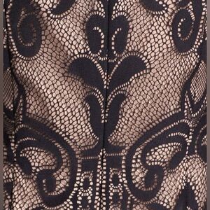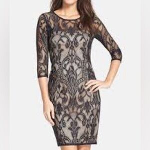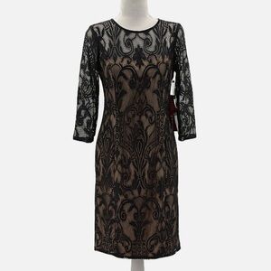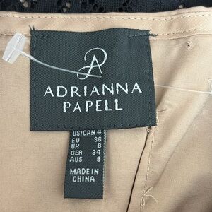 Adrianna Papell Lace Overlay Sheath Dress in Black & Tan - NEW - Size 4. New with tags. Open lace overlay in black, lined from bodice down, 3/4 open lace sleeves, hidden back zip closure, kick split. Approximate measurements: 16 1/2" pit to pit, 37" length. Above knee on me and I'm 5'5".