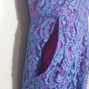 Striking fit and flare boatneck party dress in fuschia with purple lace overlay, giving an iridescent effect. Has pockets! Back zip and hook close. Falls to about knee length, depending on your height. Condition: Good, light wear on fabric.