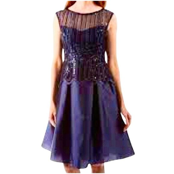 Adrianna Papell Lace Sequin Taffeta Cocktail Dress 10 Knee Length Fit Flare Navy