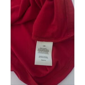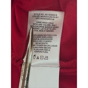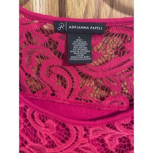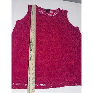 Adrianna Papell Lacey Crochet Overlay Tank Top Moroccan Ruby Red Size L Sleeveless Blouse with a round neckline and scalloped hem.