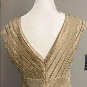 Chic gold maxi dress with layered design. Perfect for formal events.