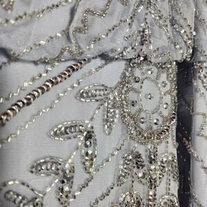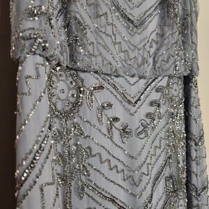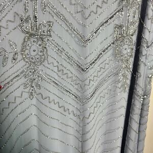 Elegant light blue maxi dress. Features intricate beadwork. Short sleeves and flowing silhouette.