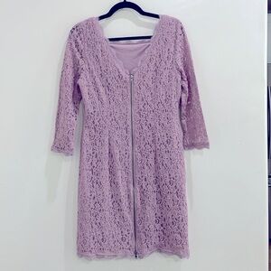 Quarter Sleeve High Scoop Neck Short Sheath Evening Formal Dress. Size 14. Lilac, lavender, lace, long sleeve, scoop neck, formal, dressy, classy, boho, bohemian, zip up, zipper closure. Last 3 images are to show fit only not same color of the dress available for sale.
