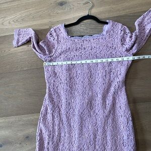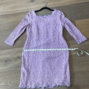 Quarter Sleeve High Scoop Neck Short Sheath Evening Formal Dress. Size 14. Lilac, lavender, lace, long sleeve, scoop neck, formal, dressy, classy, boho, bohemian, zip up, zipper closure. Last 3 images are to show fit only not same color of the dress available for sale.
