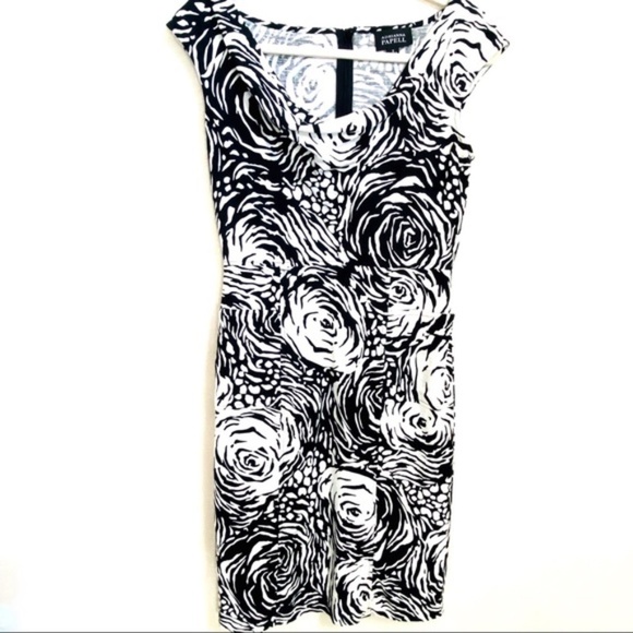A Black and White Adrianna Papell Floral Rose Swirl Cap Sleeve scoop neck Midi Dress. Back zipper detail with flattering fitted waist. Starry night
