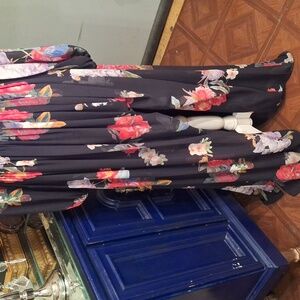 Adrianna Papell elegant black maxi dress with vibrant floral patterns. Perfect for any occasion. Pleated around collar area. Lined. Semi sheer sleeves. 28.5" armpit to armpit laying flat. 15.5" waist seam to seam.