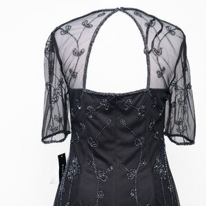 Details: Imported • Color: Black Gunmetal • Fabric: Polyester • Fully lined • Hidden back zip closure • Short illusion sleeves • Hand-beaded mesh overlay