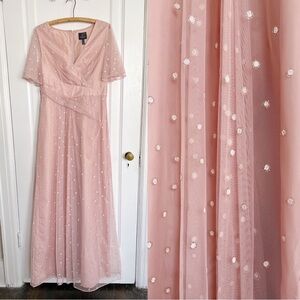 Gorgeous formal dress by Adrianna Papell. “Metallic Clip Dot Gown” style in blush pink netting with gold & white glitter dots. Surplice style wrap bodice with v-neck, flutter sleeves, flattering front draped skirt, front slit. Bust 38-39“, waist 32“, hips 42“, length 60.5“. Slit 28“. Size 10, excellent preowned condition w one small unnoticeable pull on bust (see photos).