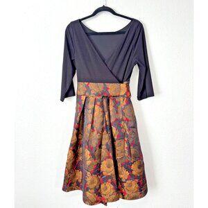 Adrianna Papell Metallic Fit & Flare Dress 12 Black Gold Floral Party Elegant