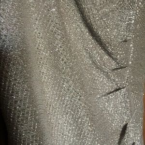A soft ruffle crowns the single shoulder of a floor-grazing dress alight in shimmering rivulets. It is lined, 100% polyester, and has been hemmed to fit me (5'5) with 4 inch heels. It has been worn once for a few hours. The material is stretch and fits sizes 2-6. The color is Champagne but reflects between a silver and champagne color depending on the light as can seen in the photos.