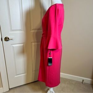 Feminine, barbiecore, barbiestyle, cocktail dress, sophisticated, bell sleeves, wedding guest, bridal shower, cocktail dress, sheath dress, midi, bow