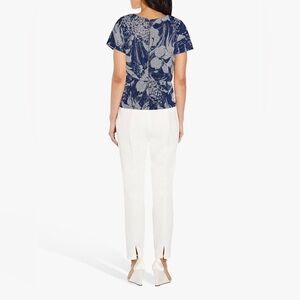 This Adrianna Papell Midnight Blue Sequined Floral Peplum Blouse is a stunning addition to any wardrobe. The blouse features a beautiful floral pattern with blue and white colors, short sleeves, and a round neckline. The blouse has a zipper closure and is made of polyester material with accents of sequins.