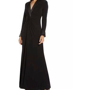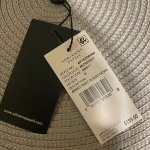 Adrianna Papell presents a chic and modern take on formal looks with this stunning gown featuring a tuxedo-inspired neckline and a twist detail at the front. Comfortable, classy and classic. Beautiful detail. Worn once for a wedding. NOTE: The dress is Midnight, which is a dark/navy blue. The first picture is the dress for sale; the last two pictures are for style only.
