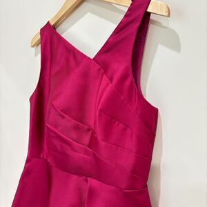 Features: Adrianna Papell Mikado Midi Satin Dress. Peplum style. Red Plum, vibrant magenta color. Asymmetric neckline. Satin with a gorgeous sheen, perfect for any formal event.