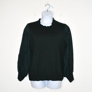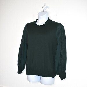 Pre-owned, good condition. No visible holes or stains. Normal signs of wear. Beautiful dark green knit. Ruffle mock neckline. Pullover. Sheer balloon sleeves with lace appliques. Size per tag: XL (Extra Large). Knit blend: Shell: 75% Viscose/ 25% Polyester. Sleeves: Combo: 100% Polyester/100% Nylon. Machine wash cold. Size per tag does not guarantee desired fit, please see pictures for measurements.