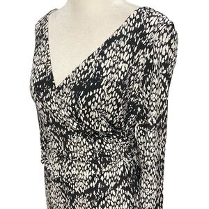 Black and white pattern. Fully lined. Nice ruched waist and below knee length. 3/4 sleeves. Size 8