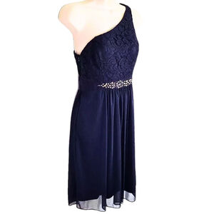 Adrianna Papell NWT Navy Blue Midi Cocktail Dress One Shoulder Lace Rhinestone 4