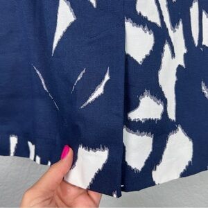 This Adrianna Papell navy floral print sheath dress is made from crisp cotton faille with a sweetheart neckline, cap sleeves, and elegant bodice seaming for a flattering silhouette. Fully lined with a back zip closure and a modest back slit that can be opened. New with tags, Size 6.