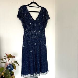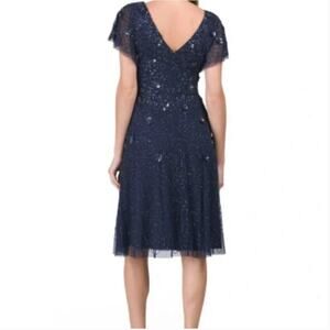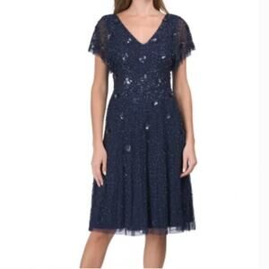 Adrianna Papell Navy Blue Floral Beaded Knee-Length Party Dress