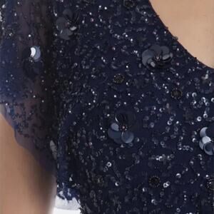 In good preowned condition. Embellished with sequin appliqués and beads. Lined. Style AP1E209116